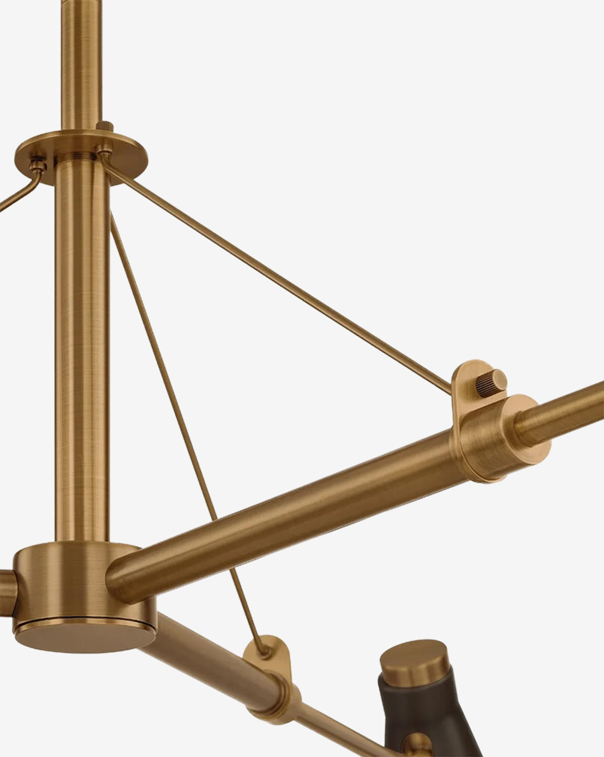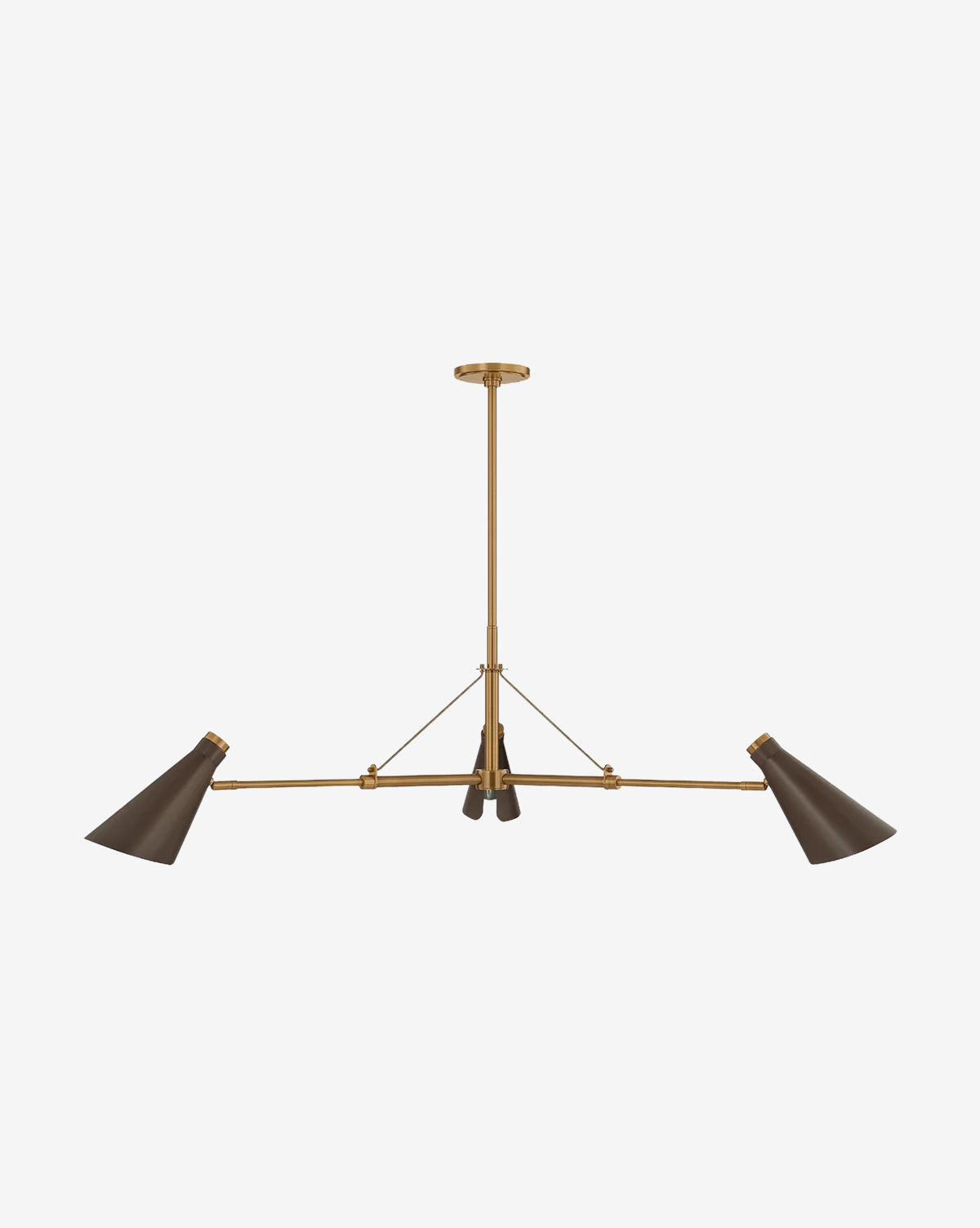 Le lustre Andersen associe un élégant laiton patiné à des abat-jour en acier finition bronze, créant une allure sculpturale et audacieuse. Sa silhouette saisissante et ses bras réglables apportent une sophistication naturelle à tout espace de vie ou de salle à manger.