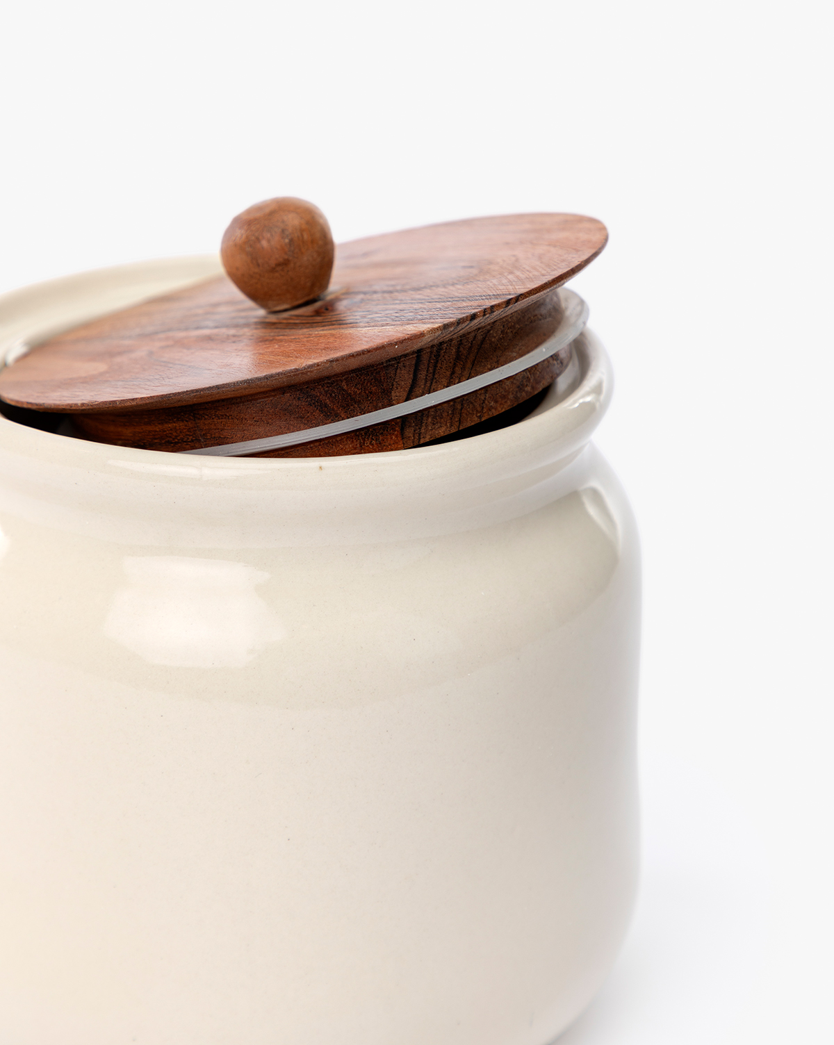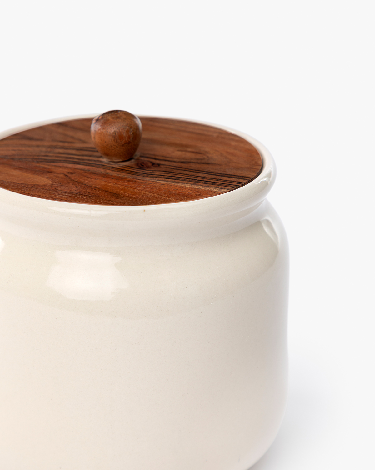 Alliant simplicité raffinée et fonctionnalité au quotidien, cette boîte en grès est dotée d'un vernis lisse et d'un couvercle en noyer. Idéale pour ranger les essentiels du garde-manger ou les petits articles ménagers, elle apporte une touche chaleureuse et organique aux comptoirs de cuisine ou aux étagères ouvertes.