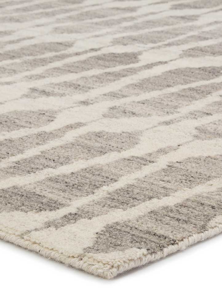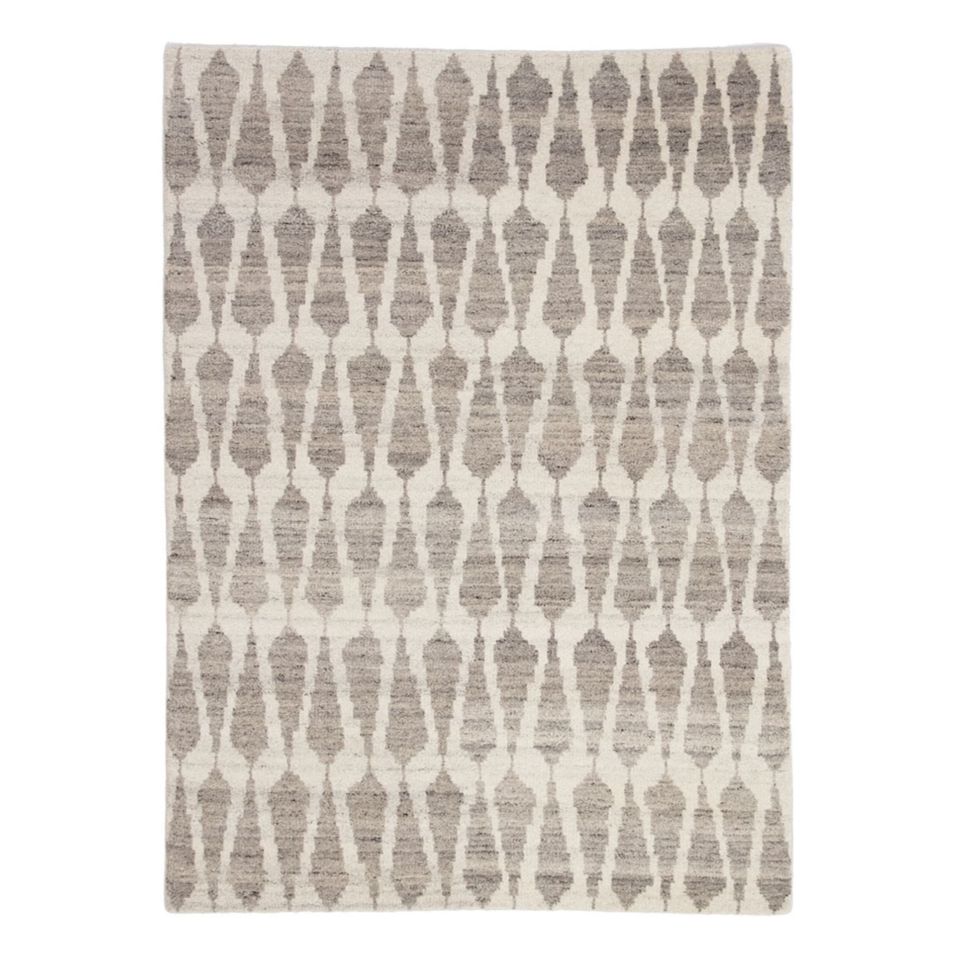 Tapis artisanal noué main, orné d'un motif audacieux. 100 % laine, décliné dans une palette de gris clair et ivoire. Fabriqué à la main en Inde.