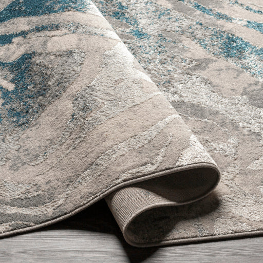 Tapis tissé à la machine. Fabriqué en 100 % polyester, durable et résistant. Poils moyens de 1 cm. Brillance éclatante. Coloris bleu sarcelle, anthracite, gris et gris clair. Fabriqué en Turquie.