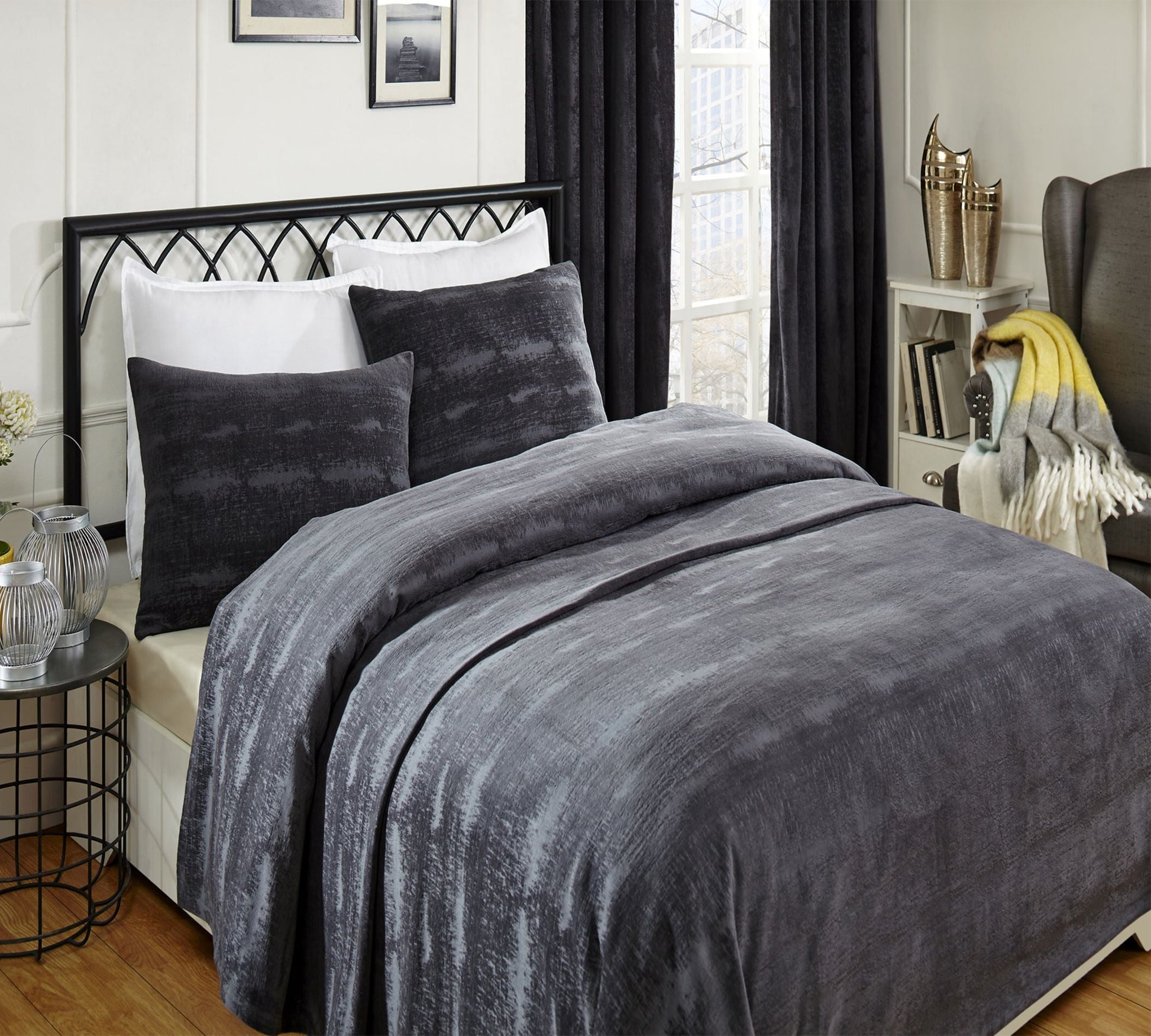 Couvre-lit et taies d'oreiller en velours écrasé - Noir