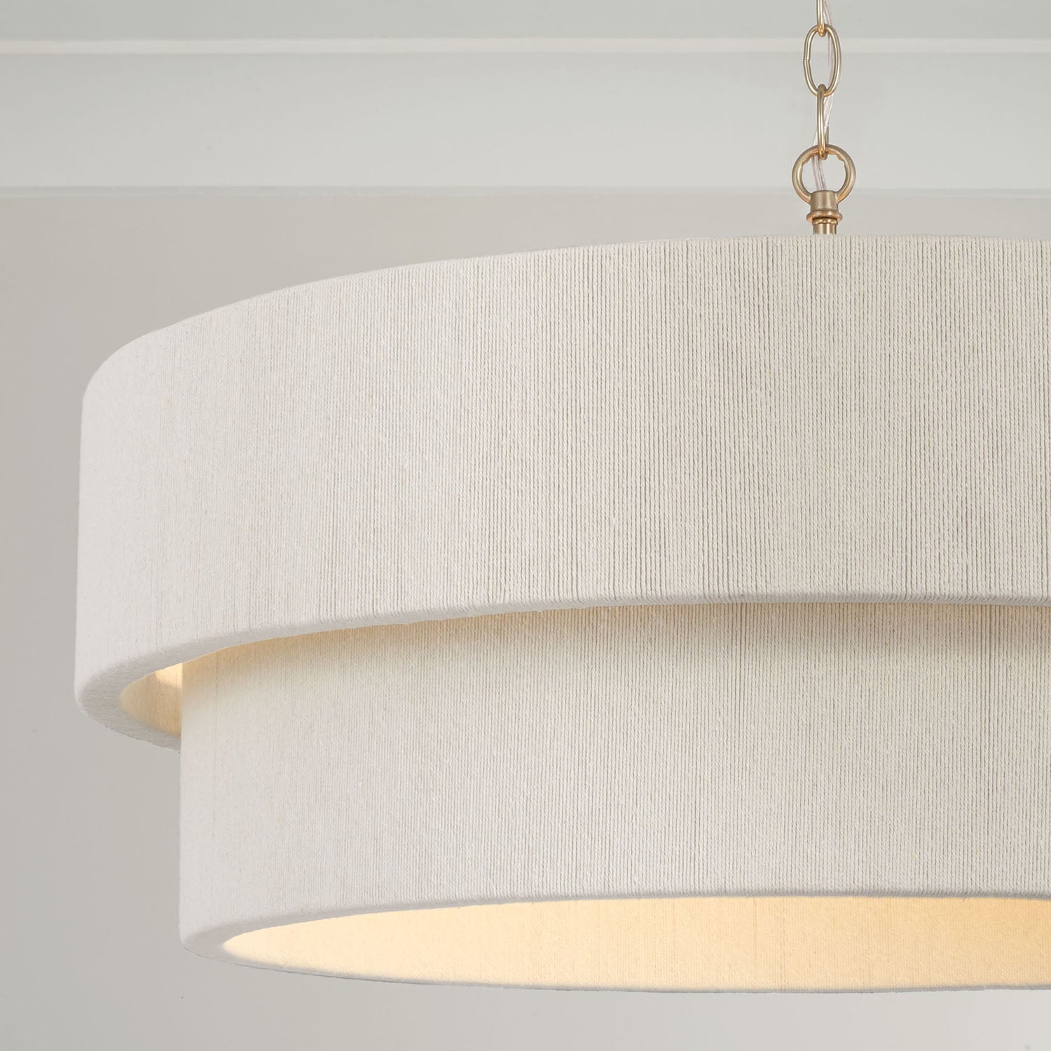 Lustre luxueux au fini laiton mat chaleureux, rehaussé d'une corde naturelle blanchie. Homologué UL. Comprend une chaîne assortie de 3 m, un câble de 4,5 m et un cache-piton. Importé.
