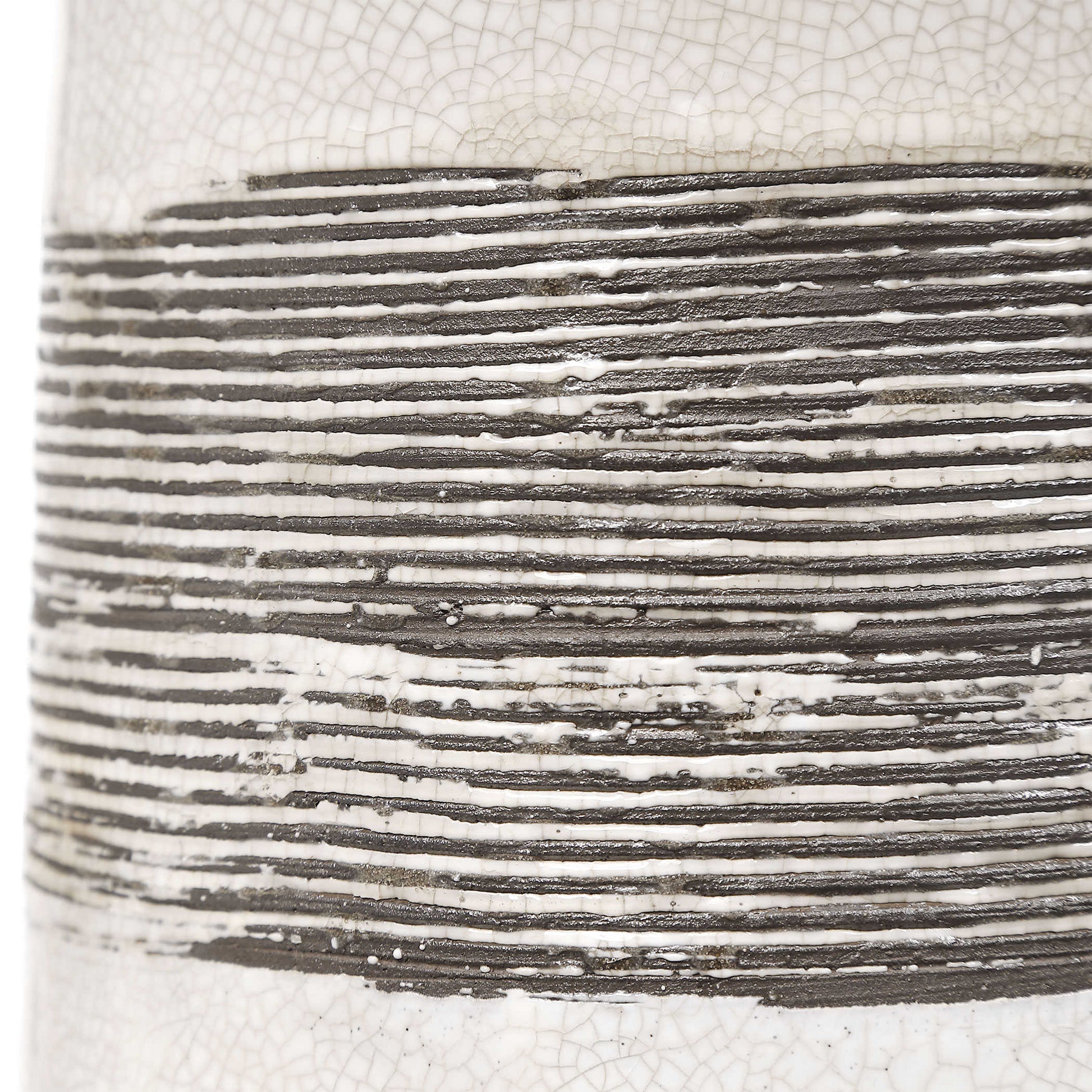 Base en céramique émaillée craquelée blanc cassé avec détails striés brun rouille. Quincaillerie en nickel brossé. Abat-jour tambour en lin gris clair. Interrupteur 3 positions. Puissance maximale : 150 W. Homologué UL. Importé.
