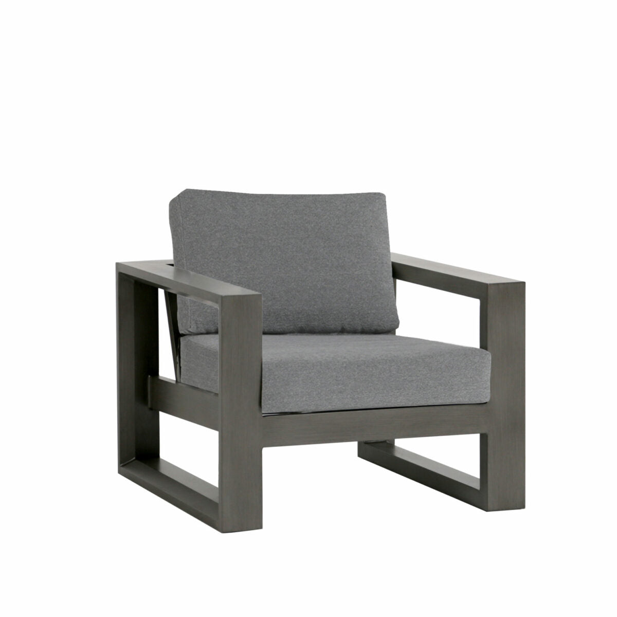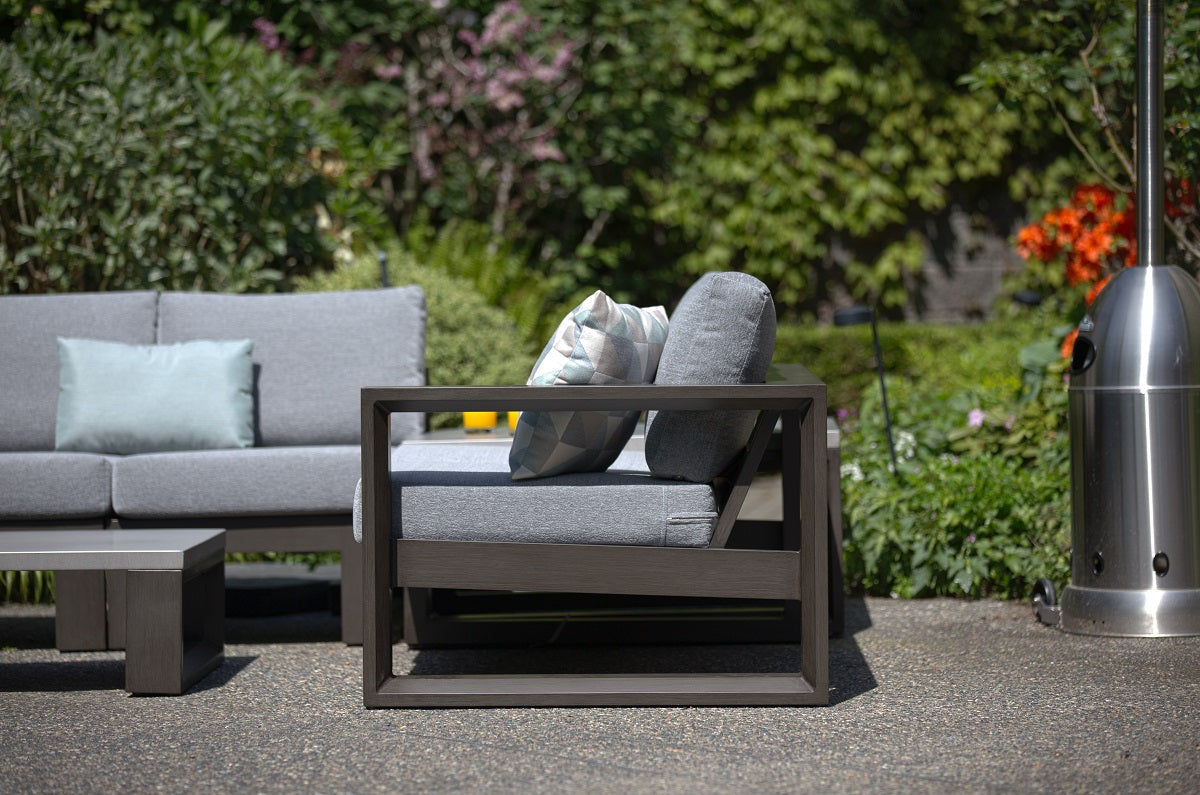 Des lignes audacieuses et élégantes définissent cette collection d'extérieur accueillante et élégante. Fabriquée exclusivement en aluminium léger, elle offre une résistance aux intempéries et une mobilité optimales. Finition gris cendré brossée à la main. Les coussins d'assise en mousse réticulée résistante aux intempéries, recouverts de tissus d'extérieur Sunbrella, garantissent une longue durée de vie et un entretien facile. Importé.