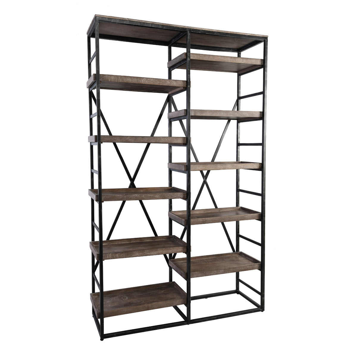 La structure en tube de fer noir vieilli et les étagères en manguier naturel créent une solution de rangement et d'exposition de style industriel idéale. Comprend dix étagères réglables, finies à la main. Fabriqué en Inde.