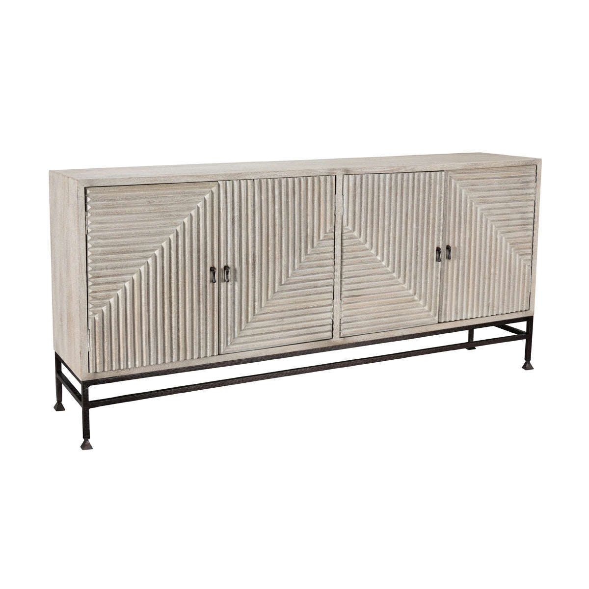 Fabriqué en manguier recyclé, il présente une finition blanche lisse et uniforme. Ses portes découpées avec précision lui confèrent une allure géométrique contemporaine, tandis qu'une base en fonte massive complète le style. Il comprend deux étagères fixes et des passe-câbles pour le câblage multimédia. Importé.