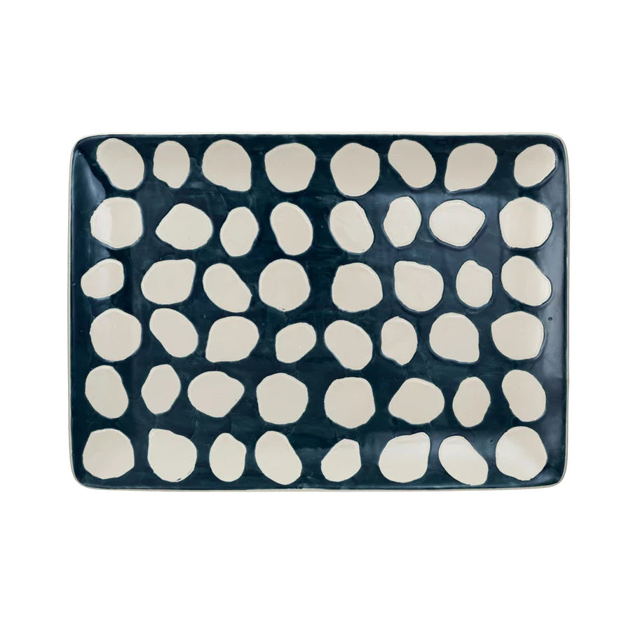 Plat en grès bleu profond peint à la main, avec points en relief de cire. Un ajout élégant et fonctionnel à tout intérieur. Convient pour un usage alimentaire.