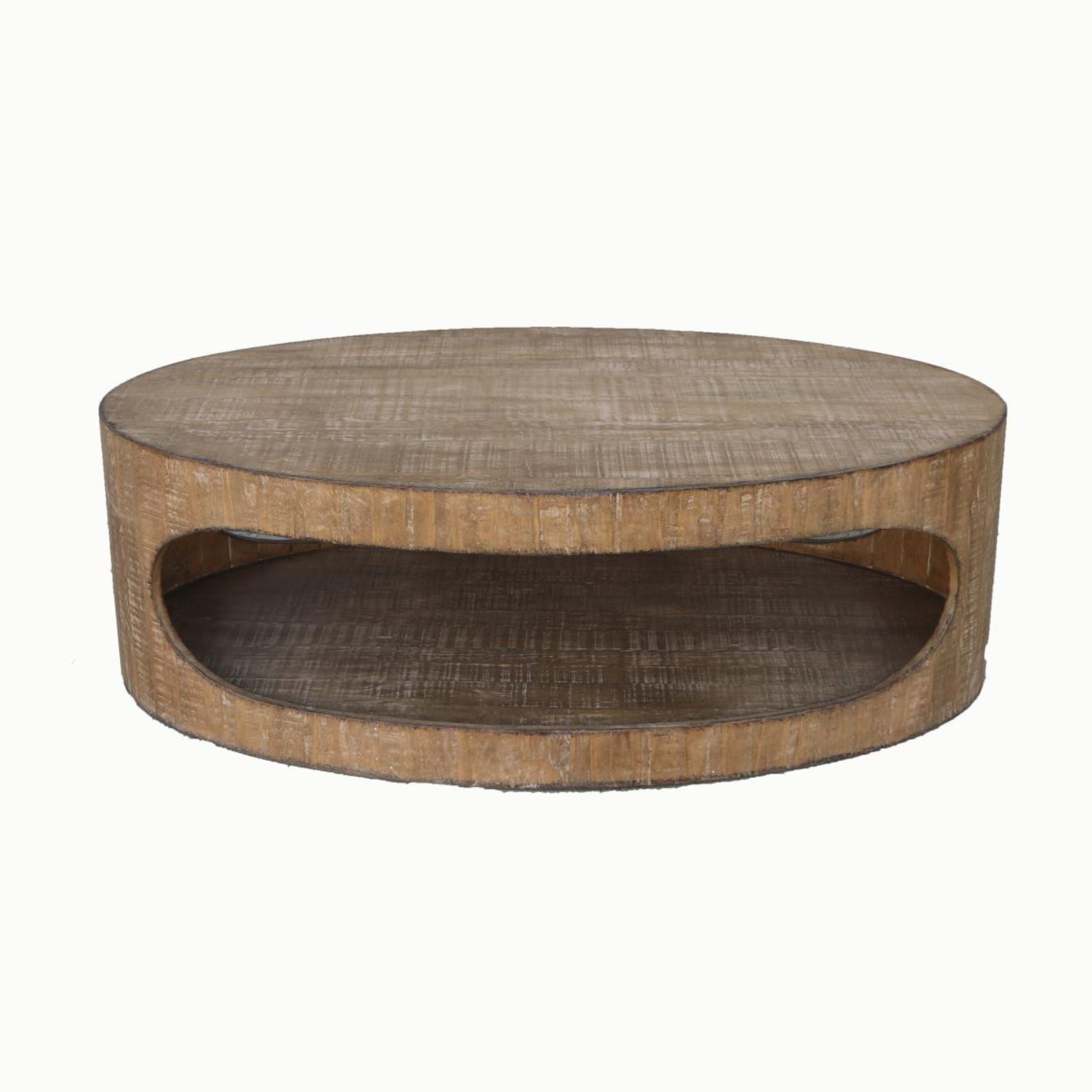 La table basse ovale Booker est fabriquée en pin recyclé avec une finition naturelle vieillie. L'étagère inférieure offre un grand espace de rangement. Importé.