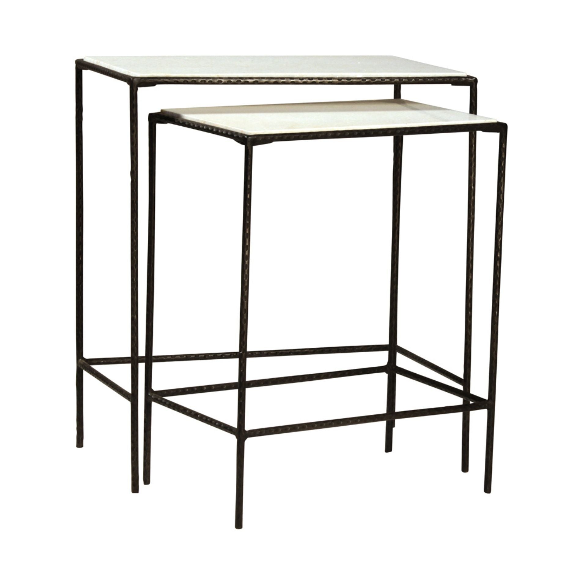 Piètement en fer forgé martelé à la main avec plateau en marbre blanc encastré. Ensemble de deux tables d'appoint gigognes. Importé.