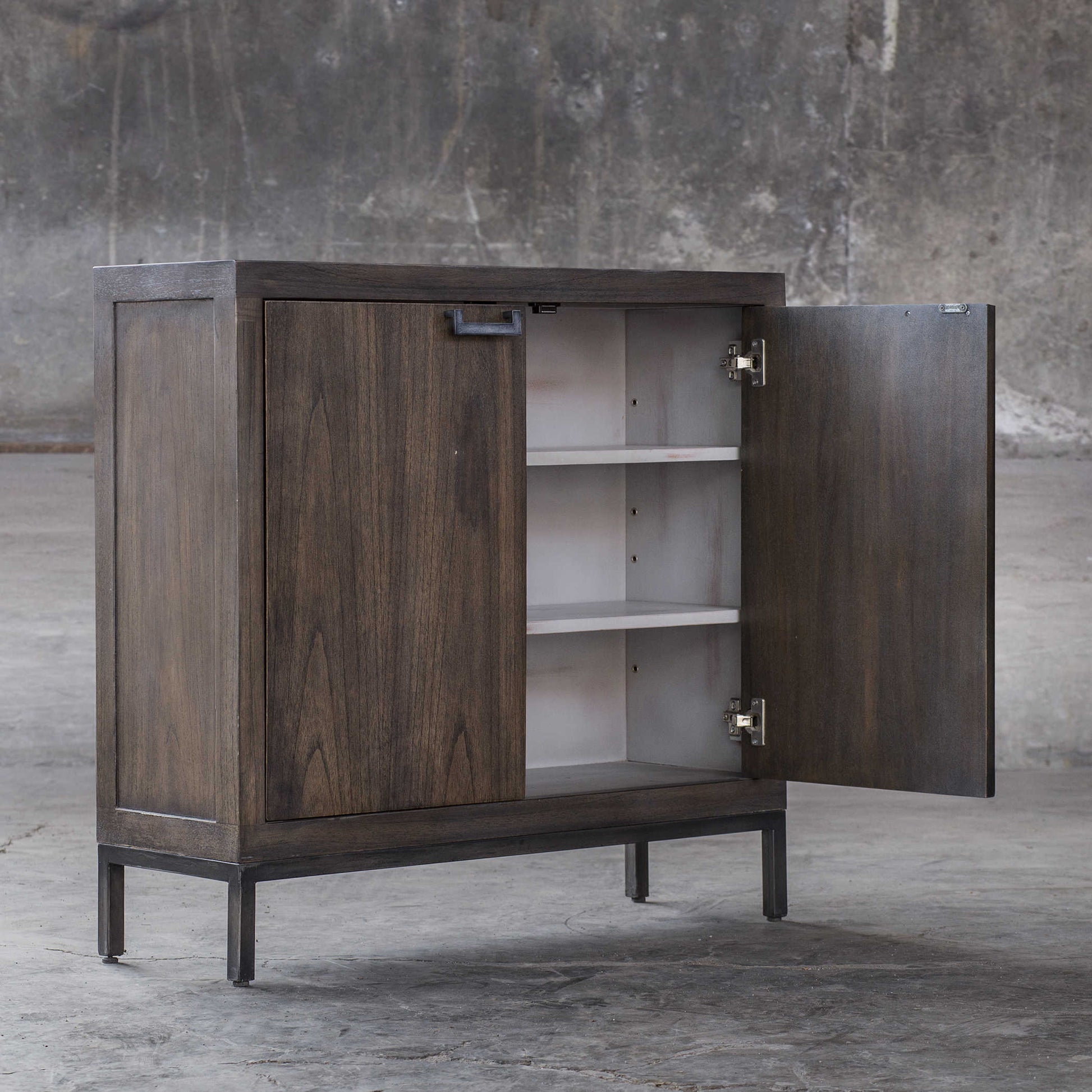 Idéale pour les petits espaces, cette console peu profonde présente des lignes contemporaines et une finition noyer doux. Un piètement en acier vieilli et des poignées de porte assorties complètent son charme sobre et intemporel. Comprend deux étagères réglables. Importé.