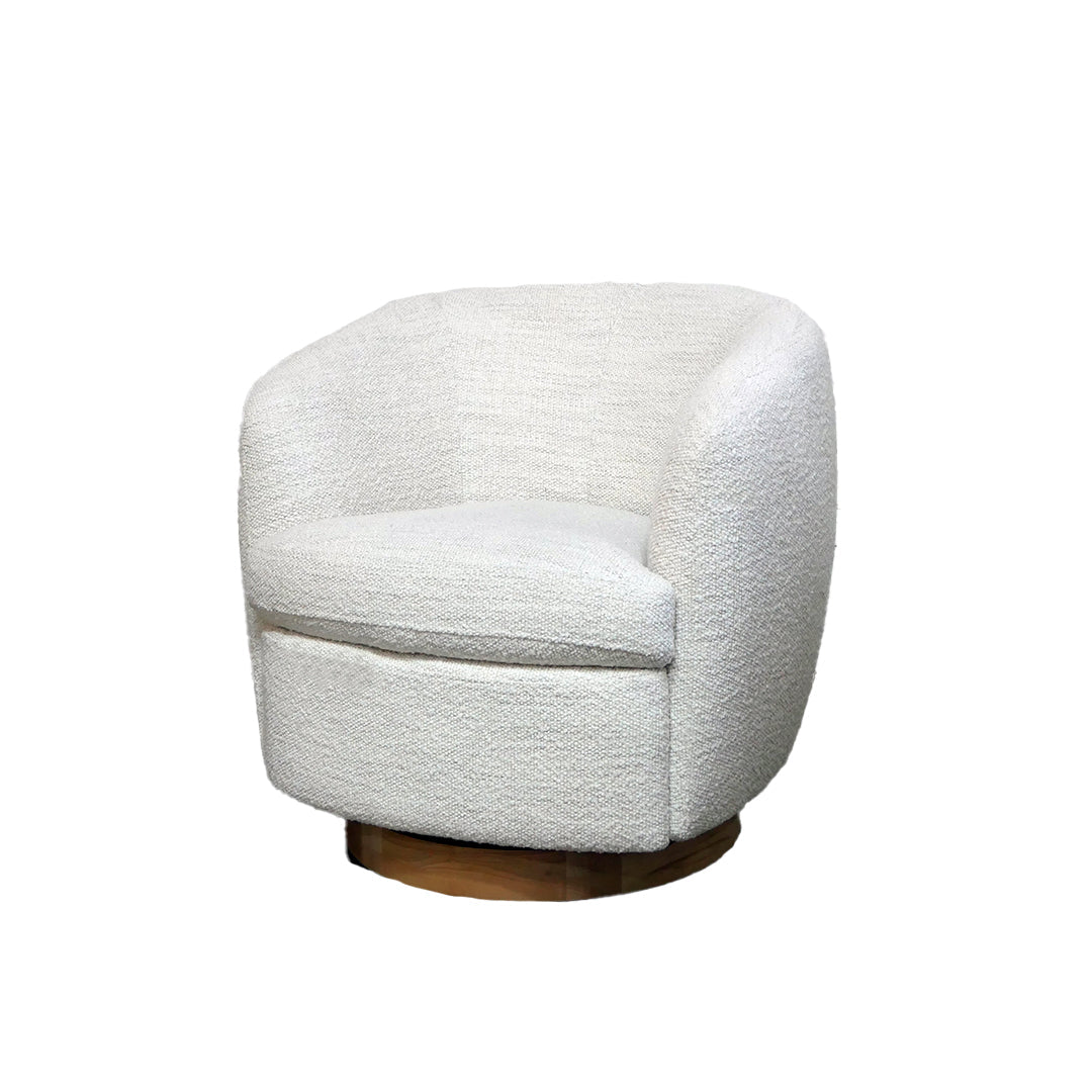 Chaise pivotante à 360 degrés, rembourrée, en tissu bouclé 100 % polyester ivoire. Piètement pivotant avec finitions en bois. Importé.