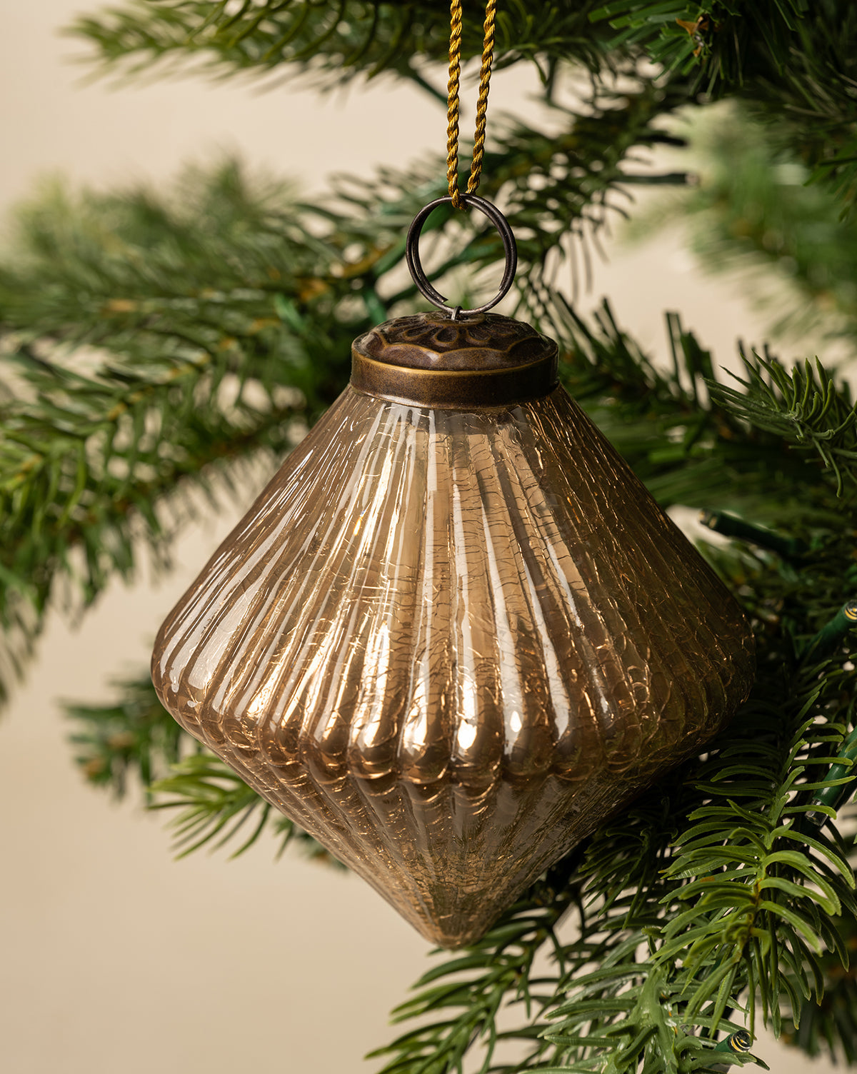 La décoration Piper arbore une palette métallique audacieuse qui reflète les lumières scintillantes du sapin tout en offrant un contraste agréable avec les branches et le pin. Fabriquée en verre avec une finition bronze, sa forme en losange est agrémentée de stries, apportant une texture raffinée à votre décoration de Noël.
