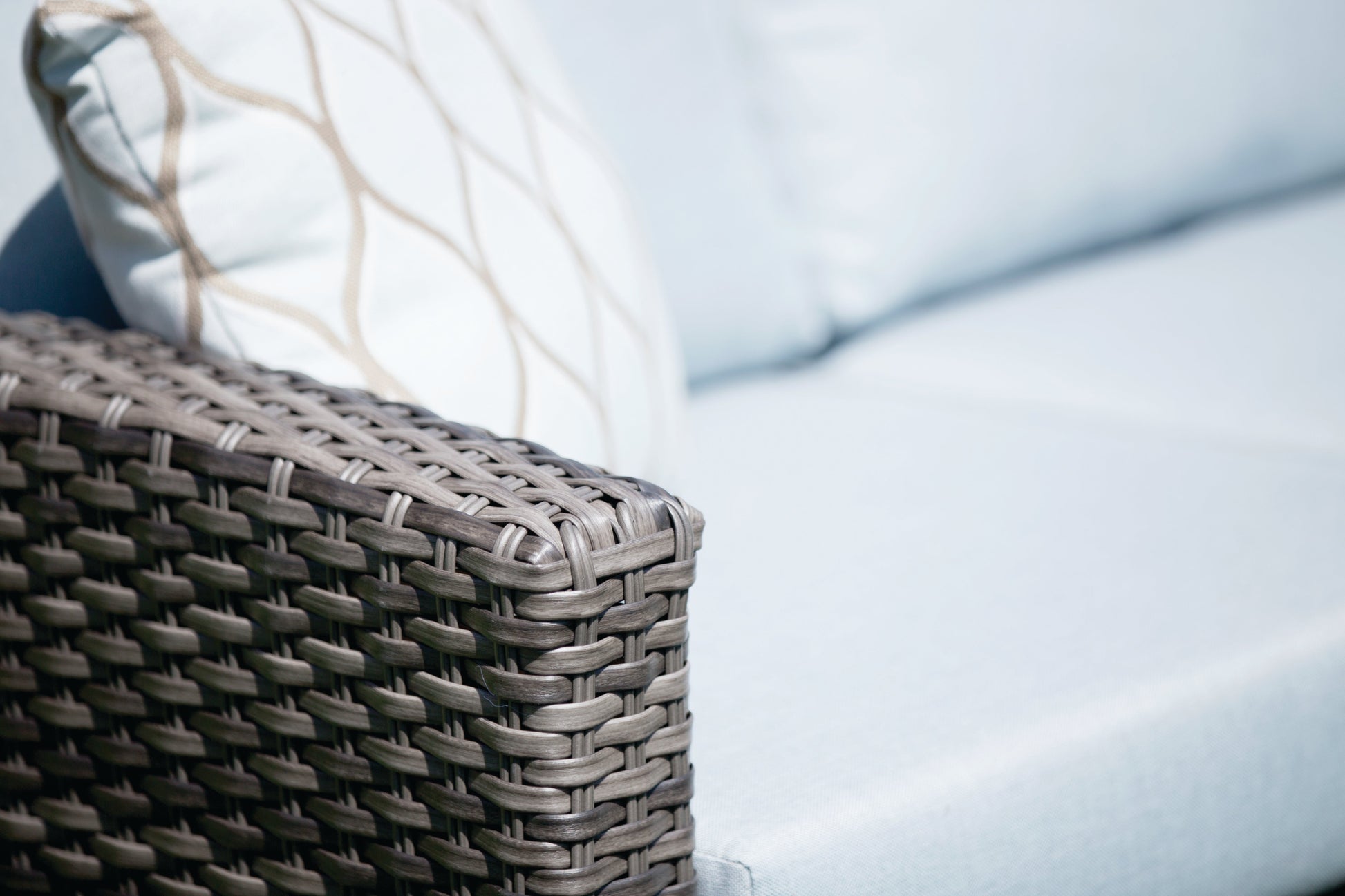 Le tissage épais et durable en résine, d'une finition gris brouillard, rappelle le tressage de l'osier. Les cadres en aluminium thermolaqué offrent résistance et durabilité, quelles que soient les conditions météorologiques.