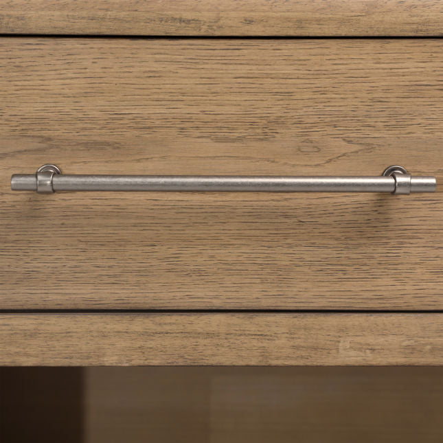 Fabriqué en bois d'hévéa avec placage en chêne finition naturelle et poignées en nickel brossé. Tiroirs à queue d'aronde sur glissières coulissantes. Fabriqué au Vietnam.